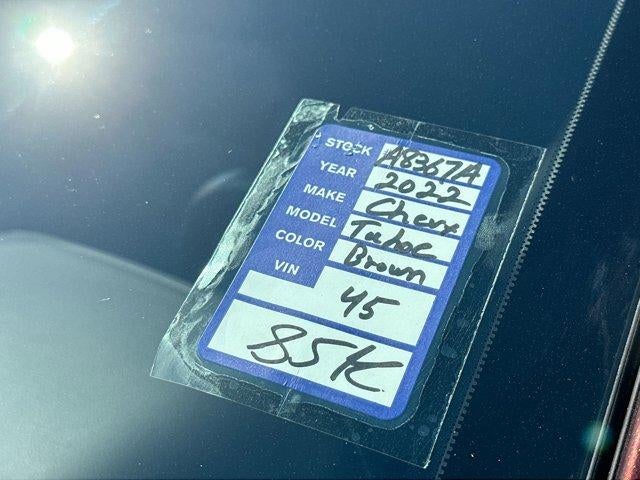 CARFAX One-Owner.This 2022 Chevrolet Tahoe Z71 in Auburn Metallic comes with the following features: EcoTec3 5.3L V8 10-Speed Automatic with Overdrive 4WD Advanced Trailering Package (Hitch Guidance w/Hitch View, Integrated Trailer Brake Controller, and Smart Trailer Integration Indicator), Driver Alert Package (Lane Change Alert w/Side Blind Zone Alert and Rear Cross Traffic Alert), License Plate Front Mounting Package, Luxury Package (2nd Row Pwr Release 60/40 Split-Folding Bench Seat, 3rd Row 60/40 Power-Folding Split-Bench Seat, HD Surround Vision, Heated 2nd Row Outboard Seats, Heated Steering Wheel, Memory Settings, Outside Heated Power-Adjustable Mirrors, Power Tilt & Telescopic Steering Column, and Rear Pedestrian Alert), Max Trailering Package (Extra Capacity Cooling System), Off-Road Capability Package (Air Ride Adaptive Suspension, Electronic Limited-Slip Differential, and Magnetic Ride Control Suspension), Preferred Equipment Group 2Z7 (1st & 2nd Row Color-Keyed Carpeted Floor Mats, 2-Speed Active Electronic AutoTrac Transfer Case, Auto-Dimming Inside Rear-View Mirror, Automatic Stop/Start, Black Tubular Assist Steps, Bose 9-Speaker Stereo Audio System Feature, Bright Front & Rear Door Sill Plates, Color-Keyed Carpeting Floor Covering, Driver & Front Outboard Passenger Airbags, Enhanced Driver Information Center, Floor Console w/Storage Area, Front High-Approach Angle Fascia, Hands-Free Rear Power Programmable Liftgate, Hill Descent Control, Infotainment Display, Leather-Wrapped Steering Wheel, LED Daytime Running Lamps, Memory Settings for Driver, Red Horizontal-Mounted Recovery Hooks, Remote Start, SiriusXM Radio w/360L, Start/Stop System Disable Button, Universal Home Remote, and Wireless Charging), Z71 Off-Road Package, 10-Way Power Driver & Passenger Seat Adjusters, 3.23 Rear Axle Ratio, 3rd row seats: split-bench, 4-Wheel Disc Brakes, 9 Speakers, ABS brakes, Air Conditioning, Alloy wheels, AM/FM radio: SiriusXM with 360L, Apple CarPlay/Android Auto, Auto High-beam Headlights, Auto-dimming Rear-View mirror, Automatic temperature control, Brake assist, Bumpers: body-color, Compass, Delay-off headlights, Driver door bin, Driver vanity mirror, Dual front impact airbags, Dual front side impact airbags, Dual-Pane Power Panoramic Sunroof, Electronic Stability Control, Emergency communication system: OnStar and Chevrolet connected services capable, Four wheel independent suspension, Front anti-roll bar, Front Bucket Seats, Front Center Armrest, Front dual zone A/C, Front High-Back Reclining Bucket Seats, Front reading lights, Fully automatic headlights, Garage door transmitter, Heated door mirrors, Heated Driver & Front Passenger Seats, Heated front seats, Illuminated entry, Leather steering wheel, Leather-Appointed Seat Trim, Low tire pressure warning, Memory seat, Navigation System, Not Equipped w/Front & Rear Park Assist, Not Equipped w/Heated Rear Outboard Seats, Not Equipped w/Heated/Ventilated Front Seats, Not Equipped w/Steering Column Lock, Occupant sensing airbag, Outside temperature display, Overhead airbag, Overhead console, Panic alarm, Passenger door bin, Passenger vanity mirror, Power door mirrors, Power driver seat, Power Liftgate, Power passenger seat, Power Release 2nd Row Bucket Seats, Power steering, Power windows, Premium audio system: Chevrolet Infotainment System 3, Premium Smooth Ride Suspension, Radio: Chevrolet Infotainment 3 Premium System, Rain sensing wipers, Rear air conditioning, Rear anti-roll bar, Rear reading lights, Rear seat center armrest, Rear window defroster, Rear window wiper, Remote keyless entry, Roof rack: rails only, Security system, Speed control, Speed-sensing steering, Split folding rear seat, Spoiler, Steering wheel mounted audio controls, Tachometer, Telescoping steering wheel, Tilt steering wheel, Traction control, Trip computer, Variably intermittent wipers, Voltmeter, and Wheels: 20" x 9" Machined Aluminum.Recent Arrival! Priced below KBB Fair Pu